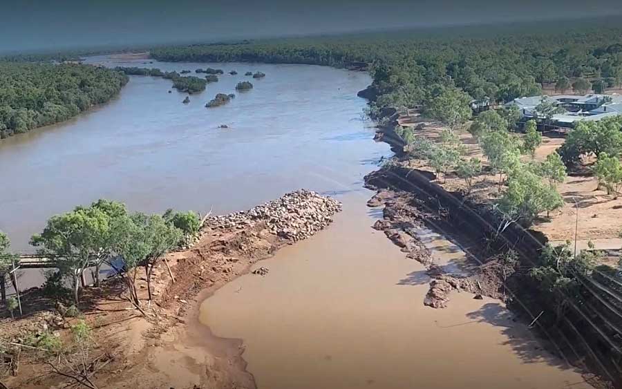 Schwere Überschwemmungen, durch den tropischen Cyclone Ellie, im Dezember 2022 und Januar 2023, verursachten erhebliche Schäden an Abschnitten des Great Northern Highway beim Willare Crossing, rund 180 km westlich von Broome und Fitzroy Crossing, auf dem Weg von Darwin nach Broome.